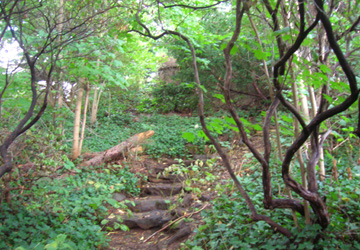 As if the University Inn isn't already the crown jewel of the Rutgers Rarities crown, another discovery was made during a daytime visit to the inn. We were informed that what appeared to be the front of the house was really the back and that the front facade was in the back of the property. We also found out that Henry Carpender, the original owner of Lindenwood, which is now the University Inn and Conference Center, was not only rich, but also very interested in nature and wildlife. The combination of the two made for a beautiful additon to Lindenwood, as exotic plants and trees were imported from all over the world, and rolling hills were artificially constructed in the front yard. Many of the plantlife was on display along an arbor trail that ran through the woods next to the property. During exploration of the trail, many fallen trees and ponds were located. The paths led to a large stagnant body of water that appeared to eventually lead out to Route 18 and toward the Raritan River. The path wound behind Old Gibbons where a rusty old water tank and old appliances were found. Heading back along the water, unidentified bones were discovered, which are shown as part of the Bones Account. We continued the journey through the woods until we were spit out the backyards of a housing complex. Once again, the woods are worth further exploration along the trails that we didn't get a chance to explore. The bones are an indication that there may be something out there.